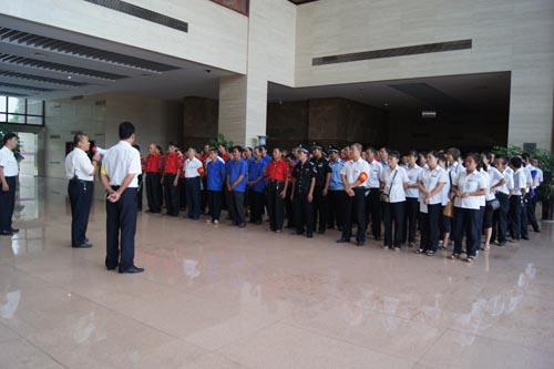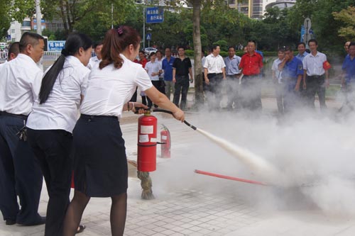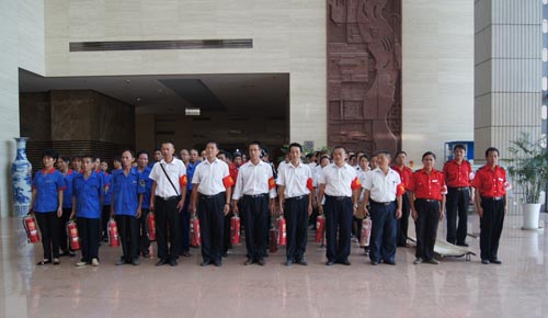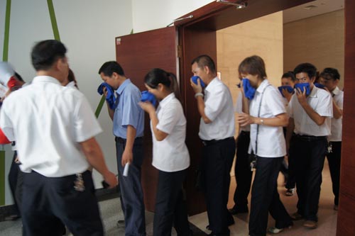 2013年7月22、27日,公司領(lǐng)導(dǎo)和各部門、各管理項目負(fù)責(zé)人及秩序維護(hù)班隊長、水電工約100余人參加了在贛州市歷史文化和城市建設(shè)博物館舉辦的消防安全演習(xí)。演習(xí)項目有模擬火災(zāi)現(xiàn)場中的緊急疏散、火災(zāi)逃生、醫(yī)療救護(hù)等項目,并有專人指導(dǎo)大家正確使用滅火器、室外消防栓的連接和使用等。上午9時,在火災(zāi)現(xiàn)場總指揮張衛(wèi)東副總經(jīng)理的指揮下,秩序維護(hù)員發(fā)出火警報警信號。各演練工作組在聽到指令后,迅速到位,參加演練的義務(wù)消防員和工作人員全部佩戴消防演習(xí)標(biāo)識,在最短的時間內(nèi),進(jìn)入展示廳、樓梯間及安全出口處,疏散組、救護(hù)組、滅火組通過口令加手勢,指揮員工從指定路線進(jìn)行有秩序地疏散,將現(xiàn)場所有人員,快捷有序地疏散到安全地帶。扮演群眾演員的公司管理人員在疏散組的指揮下從起火的樓層中手捂口鼻,俯身逃生;救護(hù)組成員抬著擔(dān)架上的受傷人員迅速從火災(zāi)現(xiàn)場撤離;滅火組成員手提滅火器迅速沖往起火點,消防演練按照預(yù)定的方案,有序、緊張地進(jìn)行。這一切,雖然都是模擬火災(zāi)中可能發(fā)生的現(xiàn)場,但是,參加人員認(rèn)真莊重的態(tài)度使演練更顯逼真。