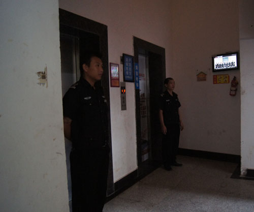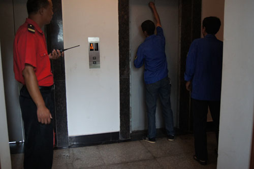 秩序維護(hù)員在“故障電梯”門前戒嚴(yán)