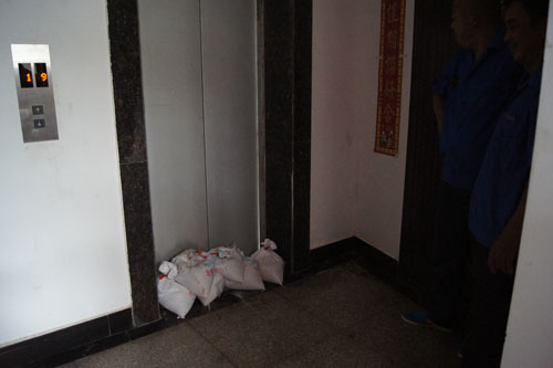 為防止電梯進(jìn)水,用沙袋堵住電梯門