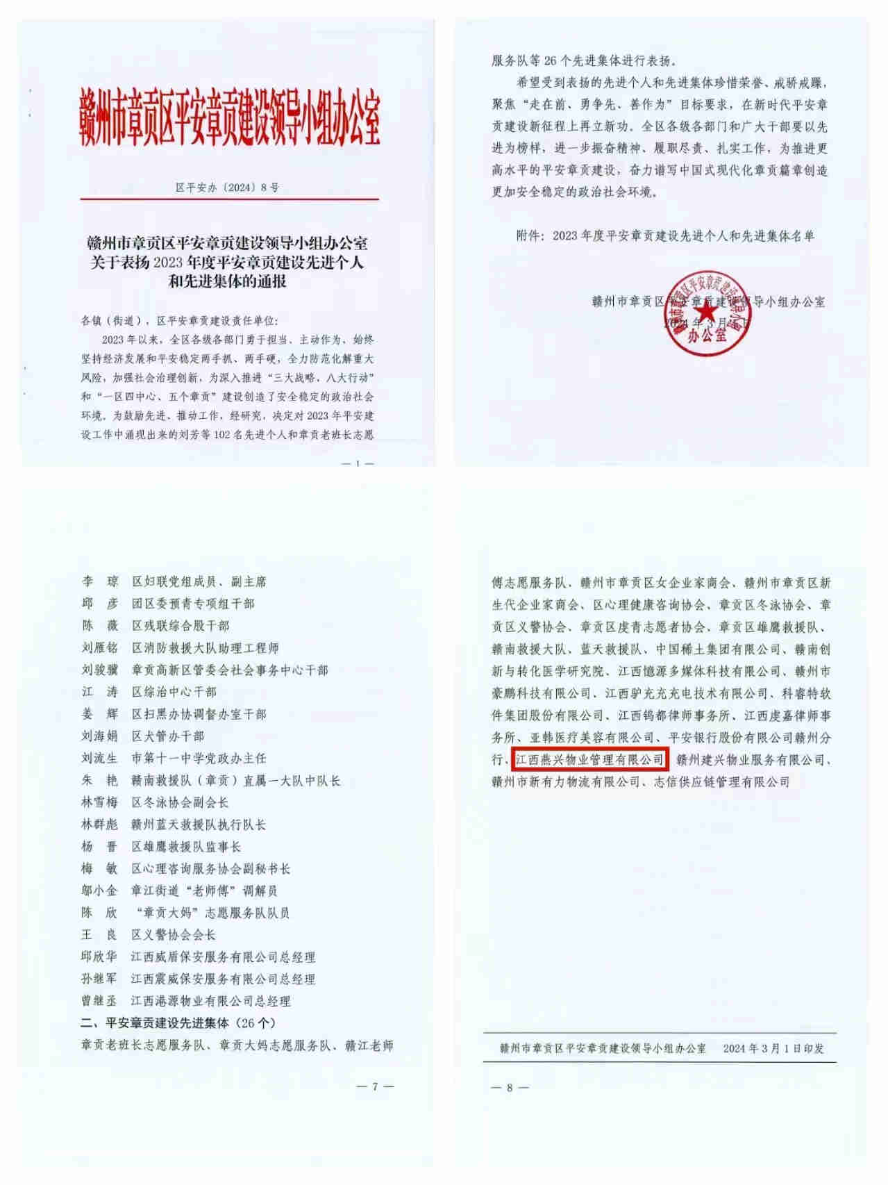 2024年3月4日,贛州市章貢區(qū)平安章貢建設領導小組辦公室下發(fā)了《贛州市章貢區(qū)平安章貢建設領導小組辦公室關于表揚2023年度平安章貢建設先進個人和先進集體的通報》(區(qū)平安辦【2024】8號),在受表彰名單中,江西燕興物業(yè)管理有限公司(現已更名江西燕興物業(yè)管理集團有限公司)榜上有名,獲評“2023年度平安章貢建設先進集體”